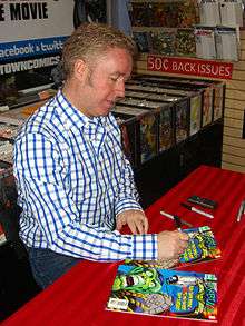 Writer Mark Millar signing copies of the book during an appearance at Midtown Comics in Manhattan.