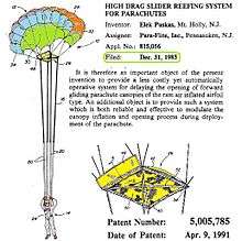 A slider is a small rectangular piece of fabric with a grommet near each corner used to control the deployment of a "ram-air" parachute. A ram-air parachute has a tendency to open very rapidly. At high velocities, the opening shock from such a rapid deployment can cause damage to the canopy or injury to the jumper. The slider was developed as a way of mitigating this. During deployment, the slider slides down from the canopy to just above the risers. It is slowed by air resistance as it descends and reduces the rate at which the lines can spread and therefore the speed at which the canopy can open and inflate. The slider also deflects some of the rising air column away from the center of the canopy as it inflates. This also helps moderate the speed of opening. [1] This invention solved the rapid deployment problem with ram-air designs. Sliders also reduce the chance of the lines twisting to cause a malfunction.