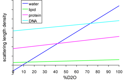 The technique of contrast variation (or contrast matching) relies on the differential scatter of hydrogen vs. deuterium. Figure 1 shows the scattering length density for water and various biological macromolecules as a function of the deuterium concentration. (Adapted from.[1]) Biological samples are usually dissolved in water, so their hydrogens are able to exchange with any deuteriums in the solvent. Since the overall scatter of a molecule depends on the scatter of all its components, this will depend on the ratio of hydrogen to deuterium in the molecule. At certain ratios of H2O to D2O, called match points, the scatter from the molecule will equal that of the solvent, and thus be eliminated when the scatter from the buffer is subtracted from the data. For instance the match point for proteins is typically around 40-45% D2O, and at that concentration the scatter from the protein will be indistinguishable from that of the buffer.