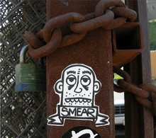 Smear has been influential in the Los Angeles graffiti scene since the late 1990s.[1][3] He was one of the first Los Angeles street artists to use street art methods in his graffiti. Before Smear, street art and graffiti art were considered separate communities. Graffiti practitioners at the time in the L.A. scene rarely ventured into the forms popularized by Smear.[3] As a graffiti artist, Smear was further distinguished from the others by his uncomplicated graffiti writing style, unlike the intricate wildstyle works which are commonly a part of graffiti art. Smear's uncomplicated style used a spontaneous repertoire of images, designs and slogans. Among Smear's most famous street art images are his "Liquor Face" character (which momentarily appears in DreamWorks Pictures' animated film Bee Movie), and another image which is a shadowy depiction of Smear's own face, with "Smear" written underneath.[3]