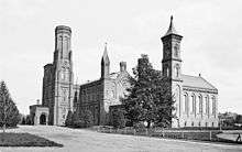 Initially intended to be built in white marble, then in yellow sandstone,[4] the architect and building committee finally settled on Seneca red sandstone from the Seneca Quarry in Montgomery County, Maryland. The redstone was substantially less expensive than granite or marble, and while initially easy to work, was found to harden to a satisfactory degree on exposure to the elements.[5] Scholarly evidence indicates it is likely that slaves were employed at Seneca in quarrying stone for the Castle, though no evidence has surfaced that slaves were involved in the actual Castle construction.[6]
