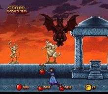 Fruit and stars can be collected while apples can be thrown at enemies and blocks.[1] Players are given four continues to stop the evil Maliss. At the final stage, either Snow White or the Shadow Man confronts Maliss in his ultimate dragon form.[1] Players can change the difficulty level (ranging from easy to medium to hard) if the game gets too frustrating for them. A vast array of continues allow players to restart failed games.