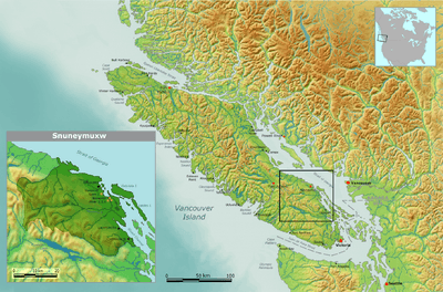 The Snuneymuxw First Nation (pronounced [snʊˈneɪməxʷ]) is currently located in and around Nanaimo on east-central Vancouver Island, British Columbia, Canada. Although the Snuneymuxw now only have a total reserve land base of 266 hectares, divided into small, separated reserves,[1] they once occupied a wide region of south-central Vancouver Island where they lived for more than 5,000 years.[2] Snuneymuxw Territory[3][4] on the eastern coast of Vancouver Island, the Gulf Islands, and the Fraser River in the British Columbia was in the center of Coast Salish territory.[3] Their language is the Hul’qumi’num language.