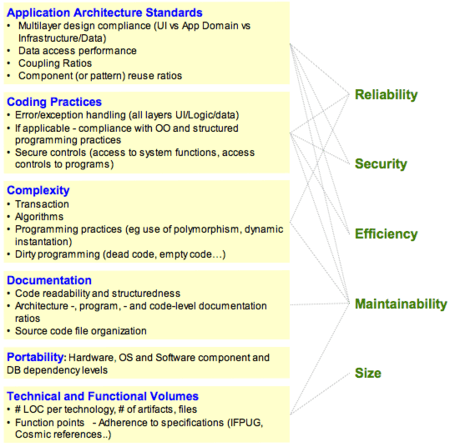 The structure, classification and terminology of attributes and metrics applicable to software quality management have been derived or extracted from the ISO 9126-3 and the subsequent ISO/IEC 25000:2005 quality model. The main focus is on internal structural quality. Subcategories have been created to handle specific areas like business application architecture and technical characteristics such as data access and manipulation or the notion of transactions.