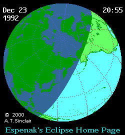 A partial solar eclipse occurred on December 24, 1992. A solar eclipse occurs when the Moon passes between Earth and the Sun, thereby totally or partly obscuring the image of the Sun for a viewer on Earth. A partial solar eclipse occurs in the polar regions of the Earth when the center of the Moon's shadow misses the Earth.