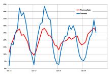 Solar power in the United States includes utility-scale solar power plants as well as local distributed generation, mostly from rooftop photovoltaics. As of the end of 2015, the U.S. has 25 gigawatts (GW) of installed photovoltaic capacity with an additional 1.8 GW of concentrated solar power.[1] In the twelve months through September 2016, utility scale solar power generated 33.3 terawatt-hours (TWh), 0.82% of total U.S. electricity. During the same time period total solar generation, including estimated distributed solar photovoltaic generation, was 51.7 TWh, 1.27 % of total U.S. electricity.[2] In 2015, 30% of all new electricity generation capacity in the country came from solar.[1] By 2015, solar employment had overtaken oil and gas as well as coal employment in the U.S.[3]