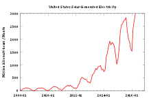 According to the U.S. Energy Information Administration, as of September 2014 utility-scale solar had sent 12,303 gigawatt-hours of electricity to the U.S. grid. This was an increase of over 100% versus the same period in 2013 (6,048 GWh).[19]
