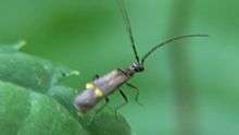 The soldier beetles (Cantharidae) are relatively soft-bodied, straight-sided beetles. They are cosmopolitan in distribution. One of the first described species has a color pattern reminiscent of the red coats of early British soldiers, hence the common name. They are also known commonly as leatherwings because of their soft elytra.[1]