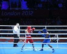 ![]() Soltan Migitinov (AZE, red) and Esquiva Falcão Florentino (BRA, blue) in their men's middleweight round of 16 bout at the 2012 Summer Olympics. | |