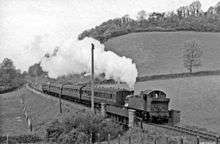 Photographs of the line when operated by the Bristol and Exeter Railway show that their 4-4-0ST locomotives were the regular motive power. Later years saw types such as GWR 4500, 4575, and 5101 'prairie' 2-6-2Ts, 2251 'Collett goods' 0-6-0s, 5700 'pannier tank' 0-6-0PTs and 4300 'mogul' 2-6-0s. In British Railways' time, these were replaced by Western Region NBL Type 2, Hymek Type 3 diesel-hydraulic locomotives, Swindon and Gloucester cross-country diesel multiple units (DMUs).[2]