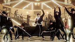A teaser trailer was released on December 26, 2013, the day of TVXQ's tenth anniversary.[6] The sixteen-second teaser showed various snippets from the actual music video, which ended with words that read "10th Anniversary Something". The full music video premiered on TVXQ's official video-sharing channels on January 1, 2014 at 6pm KST.[19] The video, filmed sometime in early December 2013 in Paju, took three days to shoot. It features a big band ensemble with TVXQ dancing in two different studio settings a brightly lit opera house set and an alleyway. The outfits worn in the video include flowery and pinstriped cutaway tailcoats, wide-legged trousers, and other roaring twenties-driven pieces, some which were by Ann Demeulemeester from the spring 2014 collection.[20] The duo closely worked with choreographer Tony Testa and performance director Hwang Sang-hoon for the song's dance choreography.[21] Inspired by the project's period setting, they added microphones in their choreography and used them as ropes. The dance has three main points (highlights): the bass guitar strumming, the boxing ring, and the marionette dance.[22] The duo had described the dance as "extremely difficult; defying the laws of gravity".[5] The highly interactive dance choreography features both male and female dancers. Drawing inspirations from swing, Charleston and modern jazz dance, it also features many inversions and sliding movements.