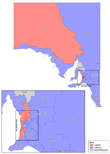 - ↑ Metropolitan 2PP correctly calculated by adding raw metro 2PP vote numbers from the 34 metro seats, both Labor and Liberal, then dividing Labor's raw metro 2PP vote from the total, which revealed a Labor metropolitan 2PP of 51.54%. Obtained raw metro 2PP vote numbers from ECSA 2014 election statistics, ECSA 2014 Heysen election and ABC 2014 Fisher by-election.