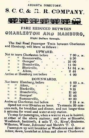 With the advent of cotton cultivation in the early 19th century, the relatively remote South Carolina upcountry enjoyed a vast expansion in the value of its agricultural produce. Overland transport by wagon was slow and expensive, so this produce tended to go to Augusta, Georgia, then down the Savannah River to the seaport at Savannah, Georgia. The SCC&RR Company was chartered on December 19, 1827 (amended January 30, 1828)[2] to divert this commerce to Charleston by means of connections to Columbia, Camden and Hamburg. Despite its novelty the project was pursued by its Charleston leaders with aggressive method, public demonstrations encouraging support for the daring concept of a steam-driven railroad. Under William Aiken as the first president, six miles (10 km) of line were completed at Charleston in 1830. The first run over the entire 136-mile (219 km) line was celebrated in October 1833.
