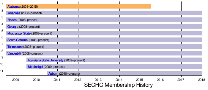 Following the 2014–15 season, both Arkansas and Alabama moved up to the ACHA Division 1 rank. Arkansas continues to field a Division 3 team that competes in the SECHC in addition to their Division 1 team. Alabama discontinued their participation in the SECHC as they no longer fielded a Division 3 team.