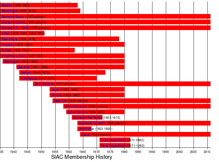 The Southern Indiana Athletic Conference (SIAC) is a high school athletic conference based in Evansville, Indiana. Five of the conferences eight schools; Bosse, Central, Harrison, North, and Reitz; comprise the public Evansville Vanderburgh School Corporation. Mater Dei and Memorial are private Catholic high schools ran by the Roman Catholic Diocese of Evansville and Vincennes, and Castle is a public school located in neighboring Newburgh in Warrick County under the Warrick County School Corporation. The league was founded in 1936, and at one point stretched far across South and West Indiana: from Mount Vernon in the west to New Albany in the east, and from Evansville in the south to Terre Haute in the north.