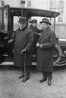 The Treaty of Rapallo between Weimar Germany and the Soviet Union was signed by German Foreign Minister Walther Rathenau and his Soviet colleague Georgy Chicherin on April 16, 1922, during the Genoa Economic Conference, annulling all mutual claims, restoring full diplomatic relations, and establishing the beginnings of close trade relationships, which made Weimar Germany the main trading and diplomatic partner of the Soviet Union.[16] Rumors of a secret military supplement to the treaty soon spread. However, for a long time the consensus was that those rumors were wrong, and that Soviet-German military negotiations were independent of Rapallo and kept secret from the German Foreign Ministry for some time.[15] This point of view was later challenged.[17][18][19] On November 5, 1922, six other Soviet republics, which would soon become part of the Soviet Union, agreed to adhere to the Treaty of Rapallo as well.[20]