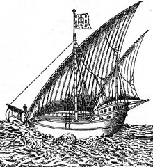 The following morning, the Spanish sent the two ships with a shallower draught to find a safe approach through the shallows.[60] The caravels anchored about one league from the shore.[44] Ten large canoes powered by both sails and oars rowed out to meet the Spanish ships. Over thirty Maya boarded the vessels and mixed freely with the Spaniards. The Maya visitors accepted gifts of beads, and the leader indicated with signs that they would return to take the Spanish ashore the following day.[60]