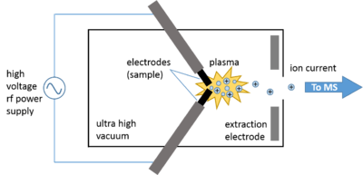 The high-voltage rf spark source is the one that was used in commercial SSMS instruments due to its ability to ionize both conducting and non-conducting materials. Typically, samples are physically incorporated into two conductive electrodes between which an intermittent (1 MHz) high-voltage (50-100 kV using a Tesla transformer) electric spark is produced, ionizing the material at the tips of the pin-shaped electrodes.[2] When the pulsed current is applied to the electrodes under ultra-high vacuum, a spark discharge plasma occurs in the spark gap in which ions are generated via electron impact. Within the discharge plasma, the sample evaporates, atomizes, and ionizes via electron impact.[7] The total ion current may be optimized by adjusting the distance between the electrodes. This mode of ionization can be used to ionize conducting, semi-conducting, and non-conducting samples.