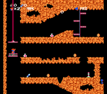 The cave in Spelunker is divided into six levels. Although the levels connect seamlessly to each other, forming one large map, the game clearly signals a level change at certain points by showing the name of the next level and giving the player a bonus, consisting of an extra life and a varying amount of points. Also, depending on memory, the next level or two were loaded from disk at that point.