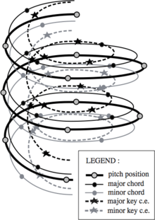 In music theory, the spiral array model is an extended type of pitch space. A mathematical model involving concentric helices (an "array of spirals"), it represents human perceptions of pitches, chords and keys in the same geometric space. It was proposed in 2000 by Prof. Elaine Chew in her MIT doctoral thesis Toward a Mathematical Model of Tonality.[1] Further research by Chew and others have produced modifications of the spiral array model, and, applied it to various problems in music theory and practice, such as key finding (symbolic and audio[2][3]), pitch spelling,[4][5][6][7] tonal segmentation,[8][9] similarity assessment,[10] and musical humor.[11] The extensions and applications are described in Mathematical and Computational Modeling of Tonality: Theory and Applications.[12]