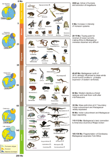 The prehistoric breakup of the supercontinent Gondwana separated the Madagascar–Antarctica–India landmass from the Africa–South America landmass around 135 million years ago. Madagascar later split from India about 88 million years ago, allowing plants and animals on the island to evolve in relative isolation.[14] Along the length of the eastern coast runs a narrow and steep escarpment containing much of the island's remaining tropical lowland forest.