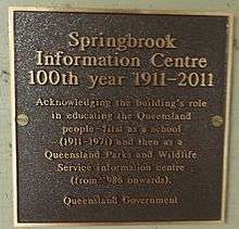 Springbrook State School is a heritage-listed former state school in Springbrook National Park at 2873 Springbrook Road, Springbrook, Gold Coast City, Queensland, Australia. It was designed by Department of Public Works and built from 1911 to 1953. It is also known as Queensland Parks and Wildlife Service Information Centre and is now part of the national park. It was added to the Queensland Heritage Register on 5 August 2003.[1]