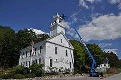 The Springfield Town Hall and Howard Memorial Methodist Church, also known as the Springfield Union Meeting House, is a historic civic and religious building on Four Corners Road southeast of New London Road (New Hampshire Route 114) in Springfield, New Hampshire. The original portion of this rectangular wood frame building was built c. 1797, but it underwent major alterations after being moved to its present location in 1851, at which time it was given its present Greek Revival and Gothic features. The upper level space continues to be used in the summer for religious services.[2]