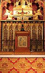 The patron of the cathedral is St Chad, a 7th-century Bishop of Mercia and pupil of St Aidan of Lindisfarne. The cathedral enshrines, in the canopy above the altar, the relics of some long bones of St Chad. These were originally enshrined at, and rescued from, Lichfield Cathedral by Prebendary Arthur Dudley, before its despoliation during the Reformation, in about 1538.[5] Fr Dudley passed the bones to his nieces, Bridget and Katherine Dudley of Russell's Hall, whence they were divided in parcels and passed down among their family. In 1651, Henry Hodgetts, a farmer, of Sedgley was dying and his wife summoned an itinerant priest, Fr Peter Turner, SJ to give him the last sacraments. When they recited the litany of the saints, Henry kept calling upon Saint Chad, pray for me. On being asked why he called upon St Chad, he replied, "because his bones are in the head of my bed". He then instructed his wife to pass the box of relics to Fr Turner for safekeeping and he took them back to the Seminary of St Omer, in Northern France, where he was based. In the 19th century, the relics found their way into the hands of Sir Thomas Fizherbert-Brockholes of Aston Hall, near Stafford. After Sir Thomas's death, his widow moved to a smaller residence and their chaplain, Fr Benjamin Hulme found the dusty velvet-covered box of relics under the altar, when he cleared out the chapel. Fr Hulme presented the relics to Bishop Walsh, who was in the process of deciding upon a suitable patronal dedication for his new cathedral. So it was that the relics of the saint who was the apostle of the Midlands in the 7th century were enshrined above the altar. It is the only cathedral in England which has the relics of its patron saint above the altar. These relics were subjected to carbon dating analysis by the archaeological laboratory of Oxford University in 1985, on the order of Archbishop Couve de Murville, which showed all but one of the bones to date from the 7th century, which concurs with the death of St Chad on 2 March 672 AD.