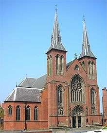 St Chad's replaced a smaller church dedicated to St Austin, built on the same site in 1808, in the Gunmakers' Quarter of the town on steeply sloping land that fell away to the canal and wharf.[6] Because of the narrow site, and the necessity to build in brick rather than stone, Pugin was restricted in the style and proportions of the church that he could design. Because he wished to make the church as open and spacious as possible, he looked as a model to the style of churches that were built in Northern Germany in the late Middle Ages.[3] St Chad's is built in the style of a brick hall church or "hallenkirke", similar to Munich Cathedral and has a westwerk with narrow broached spires similar to those of Lübeck Cathedral. Because of the steep slope of the site, Pugin built a large crypt beneath the building, to be used primarily as a burial place for family tombs,[3] and former cathedral clergy, and is now rehearsal room for the choir. The geographical alignment is unusual in that the "east end" (the location of the altar) actually faces approximately north west.