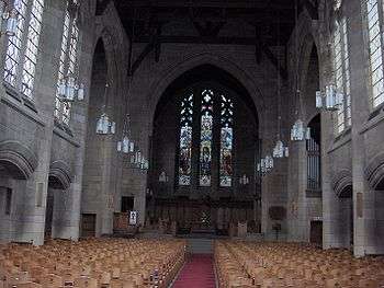 The church was designed in a Gothic revival style by the architect James Taylor Thomson (1887–1953).[23] He won the competition to design the church in 1927; it was built between 1929 and 1930. Thomson's wedding took place in the church in 1931. The church also includes elaborate oak carvings and stained glass by Douglas Strachan and Gordon Webster. Also in Glasgow, Thomson designed High Carntyne Parish Church and was involved in designing the chapel of the University of Glasgow and much of the 1937 Empire Exhibition site in Bellahouston Park.[24]