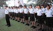 Cadet members are presently only entitled to wear the Field Uniform, which is also the most widely recognised uniform of the St. John Brigade Singapore. The Field Uniform consists of a black beret with a cap badge, depending on which is entitled to the wearer. Nursing members wear a hairnet as well. The top consists of a white short-sleeved shirt / blouse with plastic concealed buttons. Shoulder flashes bearing the Maltese Cross with twin beasts and unicorns, together with the words "St. John Singapore" are worn on both sleeves. A black epaulette is worn on both shoulders denoting the rank of the member. The bottom consists of black pants / culottes, which is worn with the St. John belt. Black socks and black low-cut boots are worn with the shoelaces tied in the formal-style.