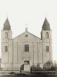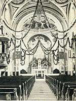 In 1913, further renovations were made. The two towers on the front of the church were razed due to the problems with the soft crumbling stone. The interior of the church was of Tuscan design. The interior has high Roman arches with two domes, one over the sanctuary and one over the center of the church. The sanctuary is 30 feet square under a dome 45 feet in height. The interior walls are decorated with murals and paintings. Seven small altars are located on the sides of the nave.[16] The front of the church was expanded through the addition of two side altars and a vestibule, extending the length by 40 feet. The facade was changed from a Tuscan Renaissance style to the Romanesque style. Later additions include the Miraculous Medal Shrine in 1930, and the current Angelus bell tower which was constructed in 1980.[17]