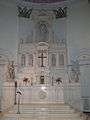 The limits of the parish grew so much in the early years by 1865, that a second church was established (St. Martin's at Fulton Avenue and West Fayette Street) and dedicated in 1867. St. Peter the Apostle was twice enlarged during its first forty years. In the summer of 1868, a thorough renovation was made with several improvements such as the addition of fifty-four pews, the building extended eastwardly, sanctuary rebuilt, gallery reconstructed, stained glass windows installed from Munich, Germany and the ceiling frescoed and ornamented. This phase was rededicated by Archbishop Martin Spalding, April 4, 1869. The dimensions were now 150 feet in length and 73 feet in width, finished in a Corinthian style of architecture although the exterior is with six Doric columns out front.[6] Archbishop James Gibbons consecrated the building on May 1, 1879, assisted by Bishops Thomas A. Becker of Wilmington, Delaware and J. J. Kain of Wheeling, West Virginia.