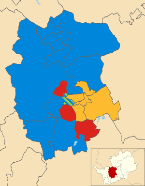 The Liberal Democrats lost control of the council as the Conservatives came up 1 seat short of taking a majority themselves, after the Conservatives gained 5 seats from the Liberal Democrats.[3] The Conservative gains took them to 29 of the 58 seats on the council, while the Liberal Democrats dropped to 24 seats.[4] Meanwhile, the Green Party gained their first councillor on the council after taking 1 of the 2 seats that were contested in St Peters ward.[3][4]