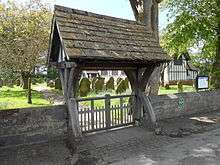 At the entrance to the churchyard is a lych gate dated 1879 which was also probably designed by Douglas. It is made of oak with a stone slate roof and is listed Grade II.[7] The churchyard contains the war grave of an army officer cadet of World War II.[8]