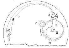 Often (as shown at right) a solid uncut section in the cam's (E) gear teeth also functioned as stopwork, limiting the mainspring so it stopped before it was wound up all the way, and stopped before it unwound all the way.[7] This restricted the mainspring to the center part of its range, further reducing force variation.