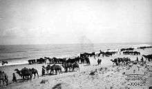 The open low-lying country occupied by the EEF was cut by deep wadis which contained many pools of good water, even when relatively dry.[75] In the Wadi Ghazza 3,000 feet (910 m) of watering troughs were constructed for horses and camels.[76] Less desirable ground water was also available. On the eastern bank of the Wadi Ghazza at Shellal, a gushing spring of salty but clear water gave the troops who regularly drank it "stomach troubles."[77]