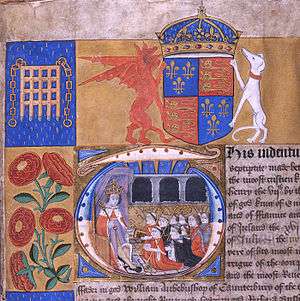 The first reference to the "star chamber"[lower-alpha 2] is in 1398, as the Sterred chambre; the more common form of the name appears in 1422 as le Sterne-chamere. Both forms recur throughout the fifteenth century, with Sterred Chambre last attested as appearing in the Supremacy of the Crown Act 1534. The origin of the name has usually been explained as first recorded by John Stow, writing in his Survey of London (1598), who noted 'this place is called the Star Chamber, at the first all the roofe thereof was decked with images of starres gilted',[2][3] Gold stars on a blue background were a common medieval decoration for ceilings in richly decorated rooms, as still to be seen at Leasowe Castle, Wirral, the Scrovegni Chapel in Padua, and elsewhere.