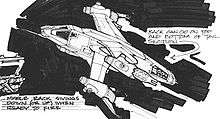Created at the request of series producer John Copeland, who wanted to expand what was seen of the Earthforce fleet as the earlier space bound Starfury was an obviously limited design, both for dramatic story telling purposes and as the only fighter apparently being used by a space based military force. Steve Burg was the designer and while trying to retain elements of the Starfury, yet have its own identity, he described this variant as being more difficult to create than the original, an early version having an elongated tail with the fins attached there, separate from the engines.[10] At the request of John Copeland it took some inspiration from the American F-15E Strike Eagle,[11] which made it a two-seater. With the second pilot sitting behind the first, the pilots in other Starfuries remain standing. The design also features an extended fuselage compared to the Starfuries and the computer model was built by Larry Bowman.