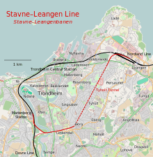 The Stavne–Leangen Line (Norwegian: Stavne–Leangenbanen) is a 5.8-kilometer (3.6 mi) railway line between Stavne and Leangen in Trondheim, Norway. The line provides an alternative connection between the Dovre Line and Nordland Line, allowing trains to bypass Trondheim Central Station. The line includes the Stavne Bridge over the river of Nidelva, Lerkendal Station and the 2.7-kilometer (1.7 mi) long Tyholt Tunnel. Construction of the line started during the Second World War by the Wehrmacht, the German military occupying Norway, in an attempt to make the railway in Trondheim resistant to sabotage. Because of the long construction time of the tunnel, tracks were laid in the city streets, but neither route was completed before the end of the war. Construction was placed on hold and the Stavne–Leangen Line did not open until 2 June 1957. At first it was primarily used by freight trains, but since 1988, passenger services have been provided.