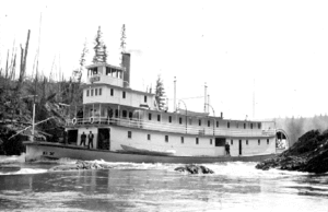 The first steamer used on the upper Fraser River was the Enterprise. She was built in 1862 near Alexandria by James Trahey for her owners Captain Thomas Wright and Gustavus Blin Wright, who also were her operators. She ran between Soda Creek and Quesnel from 1863 until 1871 when the Wrights took her to Takla Landing for use in the Omineca Gold Rush. This voyage was to be her last and she was abandoned after she made the trip. The next steamboat used on the Soda Creek to Quesnel route was also built by Trahey for the Wrights. She was the Victoria, which was built in Quesnel and put into service in 1869. She served the district for seventeen years until she was berthed at Steamboat Landing near Alexandria.[1]