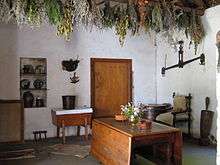 This house is the first period house in the museum complex and is furnished according to the period c. 1709. The house was built in August 1707 by Sebastian Schreuder, who was a German messenger of the court of the Dutch East India Company.[1] This modest pioneer cottage has a thatched roof and clay floor. The house has some unusual windows as glass was a rare commodity and had to be imported from Holland. The colonists therefore developed a system of stretching linen or gauze tightly over a frame and using beeswax or similar substances to seal the cloth against the elements. During a hard downpour, the housewife simply closed the outside shutters; in fine weather the catches were released, the whole frame was lifted out, and fresh air was let in.[2] The house was declared a monument in 1974 and is currently listed as a Grade II Western Cape provincial heritage site.[3]