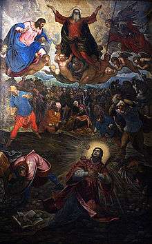 Thus castigated, the account is that the crowd could contain their anger no longer.[7] However Stephen, seemingly now oblivious to them, looked up and cried "Look! I see heaven open and the Son of Man standing on the right hand of God!" To the Sanhedrin, this claim that the recently executed Jesus was standing by the side of God[8][Acts 7:54] was such intense blasphemy that they rushed upon Stephen, drove him outside the city to the place appointed, and stoned him.[4] At this time Jewish law permitted the death penalty by stoning for blasphemy. The witnesses, whose duty it was to throw the first stones,[9][8] laid their coats down so as to be able to do this, at the feet of a "young man named Saul", later to be known as Paul the Apostle. Stephen prayed that the Lord would receive his spirit and his killers be forgiven, sank to his knees, and "fell asleep" [Acts 7:58–60]. Saul "approved of their killing him".[Acts 8:1]