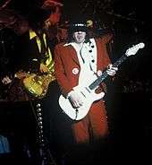 After the 1983 release of Texas Flood, Double Trouble embarked on the Texas Flood Tour in support of the album. The tour began with a series of small club performances in mid-1983. Double Trouble toured North America as an opening act for The Moody Blues in October through November 1983; for these performances, the band received $5,000 per show and a bonus for successful ticket sales.[2] Double Trouble received considerable mainstream success thereafter, performing with significantly higher production values. The tour included a performance on Austin City Limits, which was broadcast for PBS on February 28, 1984.[3] The band also performed a sold-out show at the Beacon Theatre in New York City.[4] Variety described the performance by calling Vaughan "the guitar hero of the present era".[5]