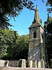 Two chapels were built: one each for Church of England and Nonconformist funerals. The Church of England one was a cruciform Gothic Revival building with a tower, broach spire and polygonal apse. In 1973 the Department of the Environment made it a Grade II listed building.[2] In 2007 its roof collapsed in a storm, and Calderdale Metropolitan Borough Council obtained listed building consent to demolish it.[3] The tower and spire survive.
