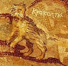 Striped hyenas are frequently referenced in Middle Eastern literature and folklore, typically as symbols of treachery and stupidity.[42] In the Near and Middle East, striped hyenas are generally regarded as physical incarnations of jinns.[12] Zakariya al-Qazwini (1204–1283) wrote in Arabic of a tribe of people called "Hyena People". In his book Marvels of Creatures and the Strange Things Existing (عجائب المخلوقات وغرائب الموجودات), he wrote that should one of this tribe be in a group of 1000 people, a hyena could pick him out and eat him.[42] A Persian medical treatise written in 1376 tells how to cure cannibalistic people known as kaftar who are said to be “half-man, half-hyena”.[12] Al-Doumairy in his writings in Hawayan Al-Koubra (1406) wrote that striped hyenas were vampiric creatures that attacked people at night and sucked the blood from their necks. He also wrote that hyenas only attacked brave people. Arab folklore tells of how hyenas can mesmerise victims with their eyes or sometimes with their pheromones.[42] Until the end of the 19th century, the Greeks believed that the bodies of werewolves, if not destroyed, would haunt battlefields as vampiric hyenas which drank the blood of dying soldiers.[43] The image of striped hyenas in Afghanistan, India and Palestine is more varied. Though feared, striped hyenas were also symbolic for love and fertility, leading to numerous varieties of love medicine derived from hyena body parts. Among the Baloch people and in North India, witches or magicians are said to ride striped hyenas at night.[12]