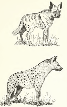 The species may have evolved from H. namaquensis of Pliocene Africa. Striped hyena fossils are common in Africa, with records going back as far as the Middle Pleistocene and even to the Villafranchian. As fossil striped hyenas are absent from the Mediterranean region, it is likely that the species is a relatively late invader to Eurasia, having likely spread outside Africa only after the extinction of spotted hyenas in Asia at the end of the last glacial period. The striped hyena occurred for some time in Europe during the Pleistocene, having been particularly widespread in France and Germany. It also occurred in Montmaurin, Hollabrunn in Austria, the Furninha Cave in Portugal and the Genista Caves in Gibraltar. The European form was similar in appearance to modern populations, but was larger, being comparable in size to the brown hyena.[4]