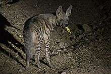 The striped hyena is primarily a scavenger which feeds mainly on ungulate carcasses in different stages of decomposition, fresh bones, cartilages, ligaments and bone marrow. It crushes long bones into fine particles and swallows them, though sometimes entire bones are eaten whole.[29] The striped hyena is not a fussy eater, though it has an aversion to vulture flesh.[30] It will occasionally attack and kill any animal it can overcome.[11] It hunts prey by running it down, grabbing its flanks or groin and inflicting mortal wounds by tearing out the viscera.[31] In Turkmenistan, the species is recorded to feed on wild boar, kulan, porcupines and tortoises. A seasonal abundance of oil willow fruits is an important food source in Uzbekistan and Tajikistan, while in the Caucasus, it is grasshoppers.[29] In Israel, the striped hyena feeds on garbage, carrion and fruits. In eastern Jordan, its main sources of food are feral horse and water buffalo carcasses and village refuse. It has been suggested that only the large hyenas of the Middle East, Asia minor, central Asia and the Indian subcontinent attack large prey, with no evidence of their smaller Arabian and east African cousins doing so.[7] Because of its scavenging diet, the striped hyena requires more water to survive than most other carnivores.[29] When eating, the striped hyena gorges itself until satisfied, though hyenas with cubs will transport food to their dens.[30] Because of the high content of calcium in its diet, the faeces of the striped hyena becomes white very rapidly, and can be visible from long distances.[28]