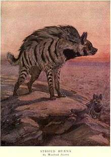 The striped hyena (Hyaena hyaena) is a species of hyaena native to North and East Africa, the Middle East, the Caucasus, Central Asia and the Indian subcontinent. It is listed by the IUCN as near-threatened, as the global population is estimated to be under 10,000 mature individuals which continues to experience deliberate and incidental persecution along with a decrease in its prey base such that it may come close to meeting a continuing decline of 10% over the next three generations.[1]