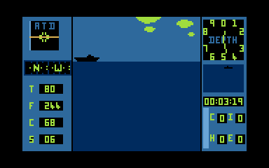 The game opens displaying the control console, whose square middle section shows a map of the Mediterranean with your current location displayed as a white cross and the locations of enemy ships as black dots.[4] Various status details are shown in the two rectangular areas on either side of the map.[5] Forward movement is controlled by the number keys, 1 for slow and 9 for maximum. On the surface the submarine moves more rapidly and recharges its batteries and air supply. The joystick provide directional control through the rudders and dive planes. This is a slow process, turning the ship right around in a 360 degree circle takes considerable time even at full speed.[6]